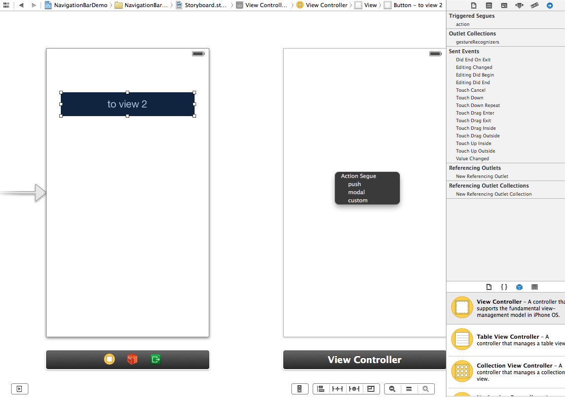 然后再拖拽一个ViewController到故事板,作为2号视图,hold 住 ctrl键,从View1的按钮,向View2的空白界面拖拽,在弹出的菜单上选择push,就得到了一个Segue,一个箭头,表明了从哪里到哪里,为了区分不同的Segue,可以给它们不同的identifier。