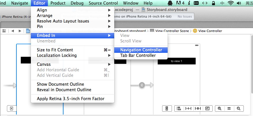 所以这时候UINavigationController要派上用场了,UINavigationController的作用,是管理一组成序列的视图,可以通过指定不同的方式切换视图(这里指定的都是push,就是从屏幕右边推入目标视图),根视图是序列中第一个视图,叫做rootViewController。实现的办法是,选中已经编辑好了的一串带有Segue的视图中的第一个,然后点击菜单,Editor–>Embed In–>Navigation Controller