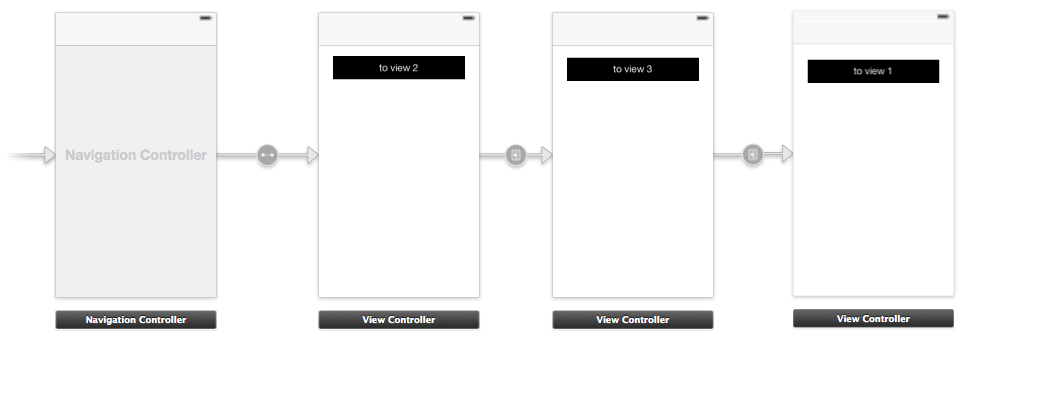 下面在拖拽一个视图ViewController 作为3号视图,然后重复上面的操作,让View2上的button可以有一个Segue指向View3,而对于View3上的按钮,我只是写着,to View 1,但是没有指向任何视图。