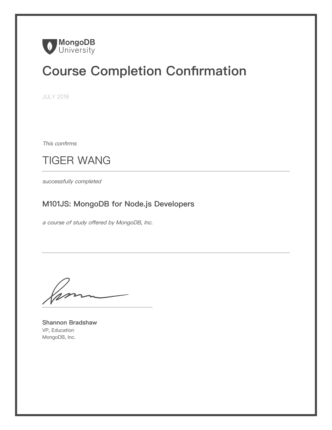 Good news. I just received a certification from MongoDB University. There it is.